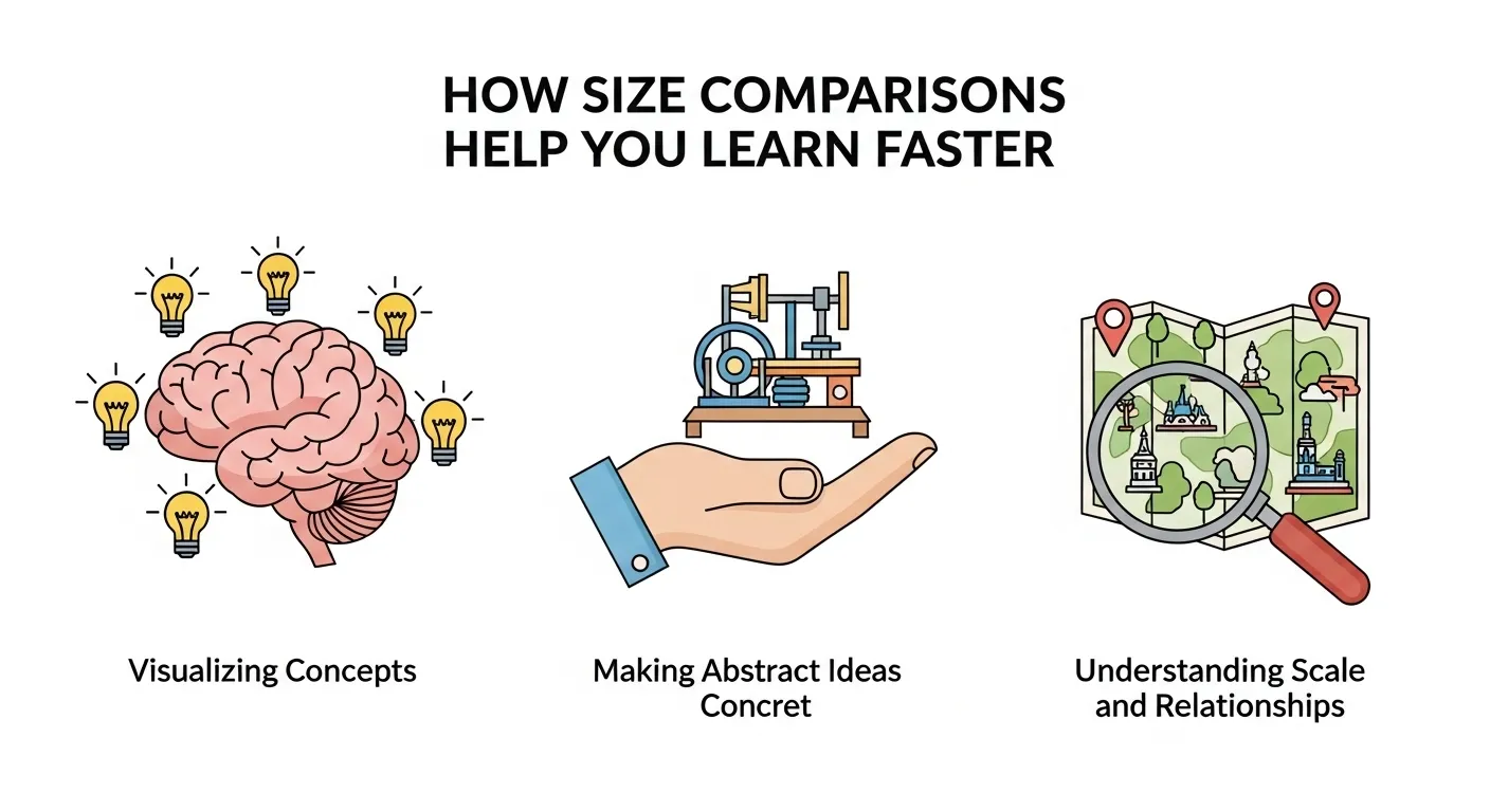 Size comparisons turn complex measurements into simple ideas. Instead of guessing how big something is, you can relate it to something you already know.